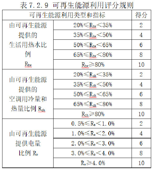 本條對由可再生能源提供的生活熱水比例、空調(diào)用冷量和熱量比例、電量比例進(jìn)行分檔評分。當(dāng)建筑的可再生能源利用不止一種用途時,可各自評分并累計,當(dāng)累計得分超過10分時,應(yīng)取為10分。空氣源熱泵及工業(yè)余熱、廢熱提供生活熱水時評分也參照可再生能源提供生活熱水比例計算方法。